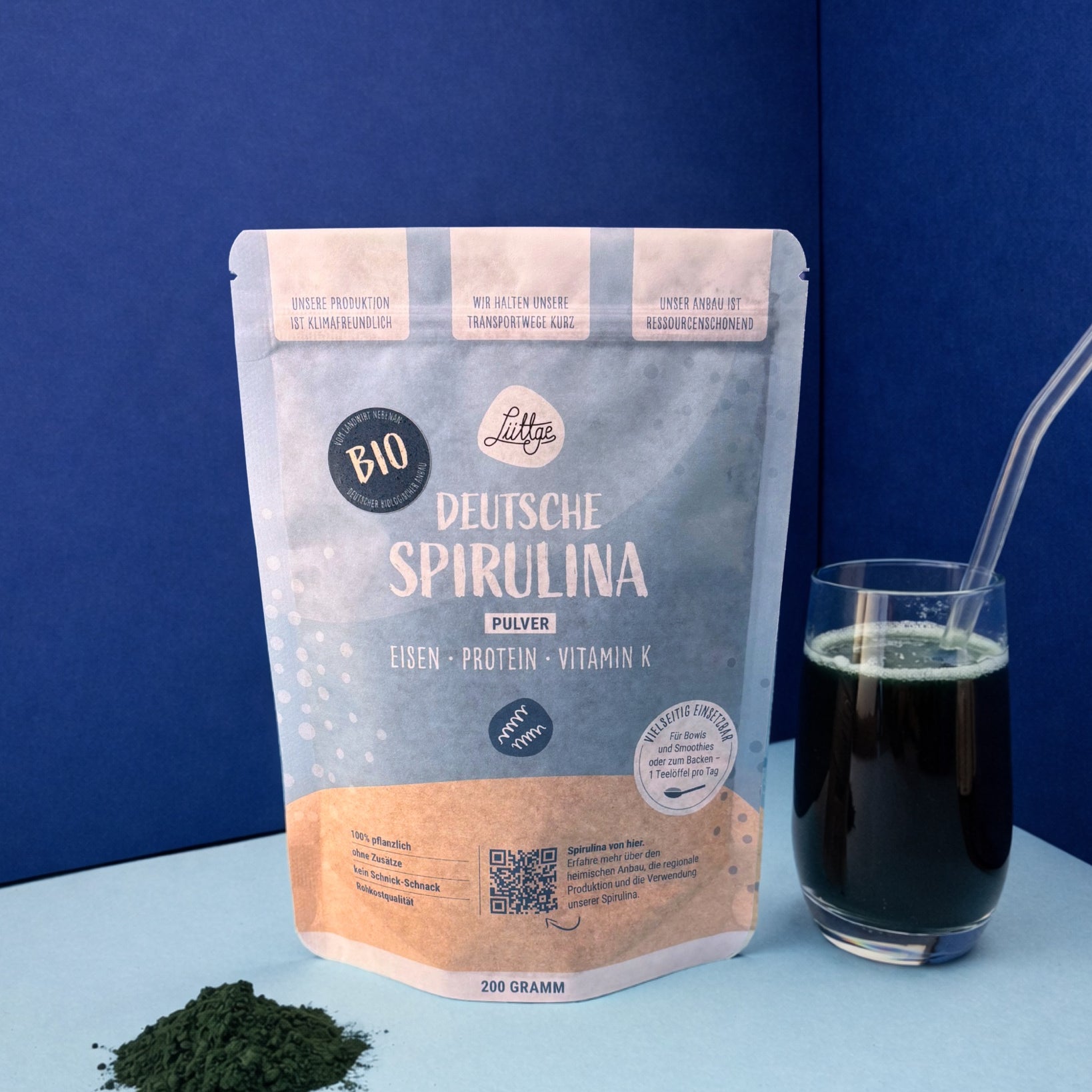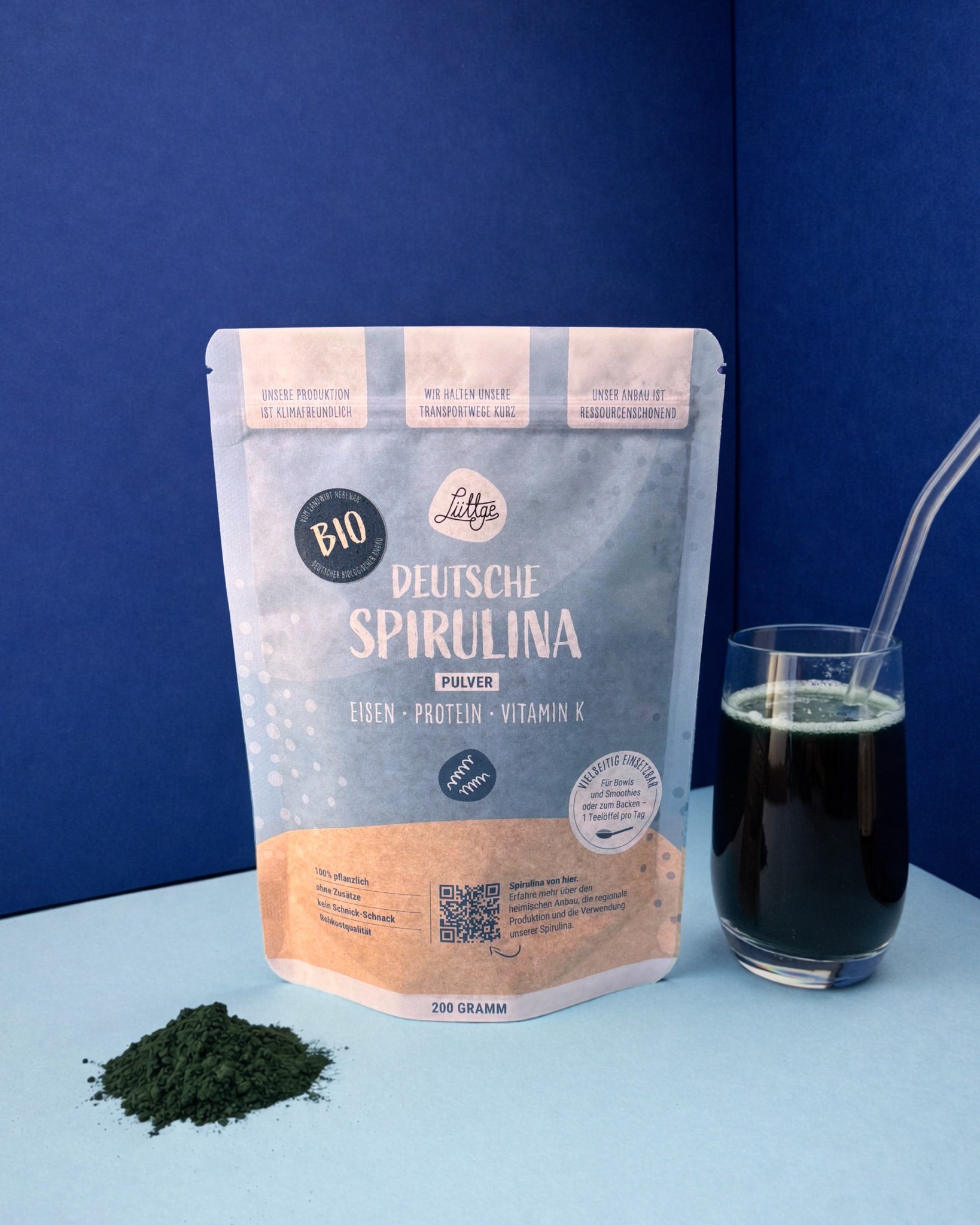 Zutaten: Bio-Spirulina Alge (100 %) I Nährwerte: (s. Tabelle, Produktbilder) aus Norddeutschland (DE-ÖKO-006)